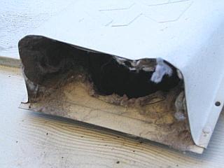 15) Downspouts have no extensions, or have extensions that are ineffective. This can result in water accumulating around the structure's foundation, or in basements and crawl spaces if they exist. Accumulated water is a conducive condition to wood destroying insects and organisms, and may also cause the foundation to settle and possibly fail over time. Repairs should be made as necessary, such as installing or repositioning splash blocks or adding extensions so rain water is carried at least several feet away from the structure to soil that slopes down and away from the structure.