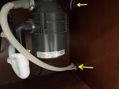 18) No high loop or air gap was visible for the dishwasher drain. A high loop is created by routing the drain line up to the bottom surface of the counter top above and securely fastening it to that surface. An air gap is a device that makes the drain line non-continuous. Both of these prevent waste-water backflow from entering the dishwasher, and possibly flooding out of the dishwasher if/when a siphon occurs. Some newer dishwashers have these devices built in. The client should try to determine if these devices are built in to this brand and model of dishwasher (e.g. review installation instructions). If not, or if this cannot be determined, then recommend that a qualified contractor install a high loop and air gap per standard building practices.