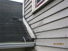 25) Repair/Replace - The siding on one or more exterior walls above lower roof sections is in contact with or has less than a one inch gap between it and the roof surface below. A gap of at least one inch is recommended so water isn't wicked up into the siding from the shingles below, and also to provide room for additional layers of roofing materials when the current roof surface fails. Recommend having a qualified contractor make repairs as necessary, such as trimming siding, so at least a one inch gap exists between the siding and the roofing below where necessary.