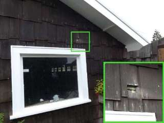 5) A small squared hole was noted on the north side exterior of the detached garage. It appeared as if something were removed from this spot (perhaps an electrical receptacle of some sort.) This should be covered to help prevent intrusion from elements, moisture, and/or pests such as rodents, insects, or other wood-destroying organisms. Work to be completed by licensed general contractor or other qualified party.