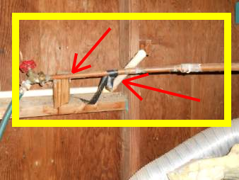 Photo 59-3 Improper gas piping still in use and main copper gas line is unsupported - have licensed plumber correct these conditions for your safety.