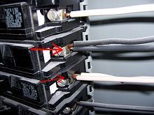17) 2 circuit breakers are "double tapped", where 2 or more wires are clamped in a terminal designed for only one wire. This is a safety hazard since the bolt or screw may tighten securely against one wire, but leave others loose. Arcing, sparks and fires may result. A qualified electrician should evaluate and repair as necessary.