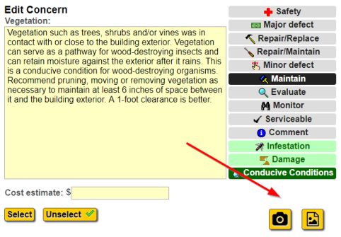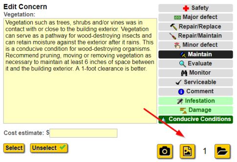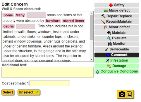 Click the concern to open a dialog that lets you edit, select or unselect the concern. You'll be able to edit the concern text, change the selected concern types, enter a cost estimate, or take pictures for the concern. For more information on taking pictures for concerns, see this.