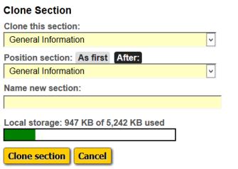 A dialog will open that lets you select the section to clone, determine what position the new section will have, and name the new section. Section names must be unique within a report. The "local storage" indicator is displayed here to warn about low space conditions, since cloning large sections may consume significant amounts of local storage. Click the "Clone section" button to clone the section and close the dialog. Your report will be saved automatically.
