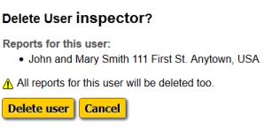 A confirmation screen will appear showing the username and any reports they may own. Click the "Delete user" button to delete that account and all reports owned by that user, and to return to the main screen. This will only affect ReportHost for tablets. Deleting a user account here will not delete it on the ReportHost website.