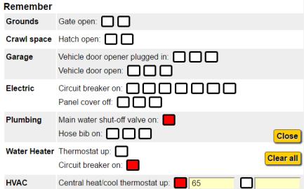 When you click the "Remember" button, the remember dialog will open. Typical uses for the Remember feature include noting that you've changed a thermostat setting, turned a circuit breaker on, tripped a GFCI, have a bathtub filling or have a water shut-off valve turned on.