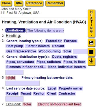 You don't need an internet connection to record your findings. You can turn your tablet off after starting reports, drive to your inspection where there's no internet connection, turn your tablet back on, navigate to ReportHost for tablets' URL (https://www.reporthost.com/rh4t2.asp), and open your report(s) for editing. After you open a report or start a new one, you'll see yellow buttons for editing your report title, viewing reference sheets, and using the "Remember" feature at the top of the page. Floating buttons on the right side let you jump to the top or bottom of the page, change report sections, save your report and hide the report.