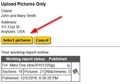 When you do, your working report's status will be displayed similar to how it is when you upload a report. Click the "Select pictures" button to proceed.