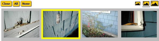 All pictures for the report you selected will be displayed. Click individual pictures to select or unselect them. Selected pictures will appear with a yellow highlight around them. Click the "Close" button to return to the upload pictures dialog, then click the "Upload" button to upload the selected pictures to your working report.