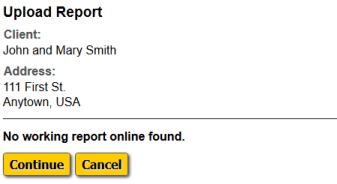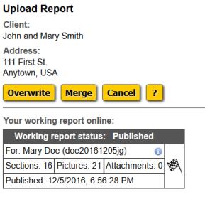 If you don't have a working report online, click the "Continue" button to upload. If you do have a working report online, then you can either click the "Overwrite" button to delete your working report online and then upload (what most inspectors should do), or click the "Merge" button to add your report information to your working report online. The merge option is meant for multiple inspectors working as a team on the same inspection.